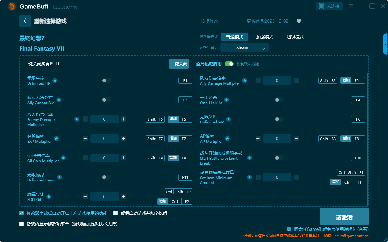 最终幻想7十三项修改器是一款操作极其简单的游戏辅助修改器工具,功能也很强大实用,支持自由设置拥有无限生命、一击必杀、无限MP、AP倍率、经验倍率、无限物品、编辑金钱、队友无法死亡、敌人伤害倍率、设置物品最低数量等十三项功能内容,感兴趣的玩家千万不要错过哦!