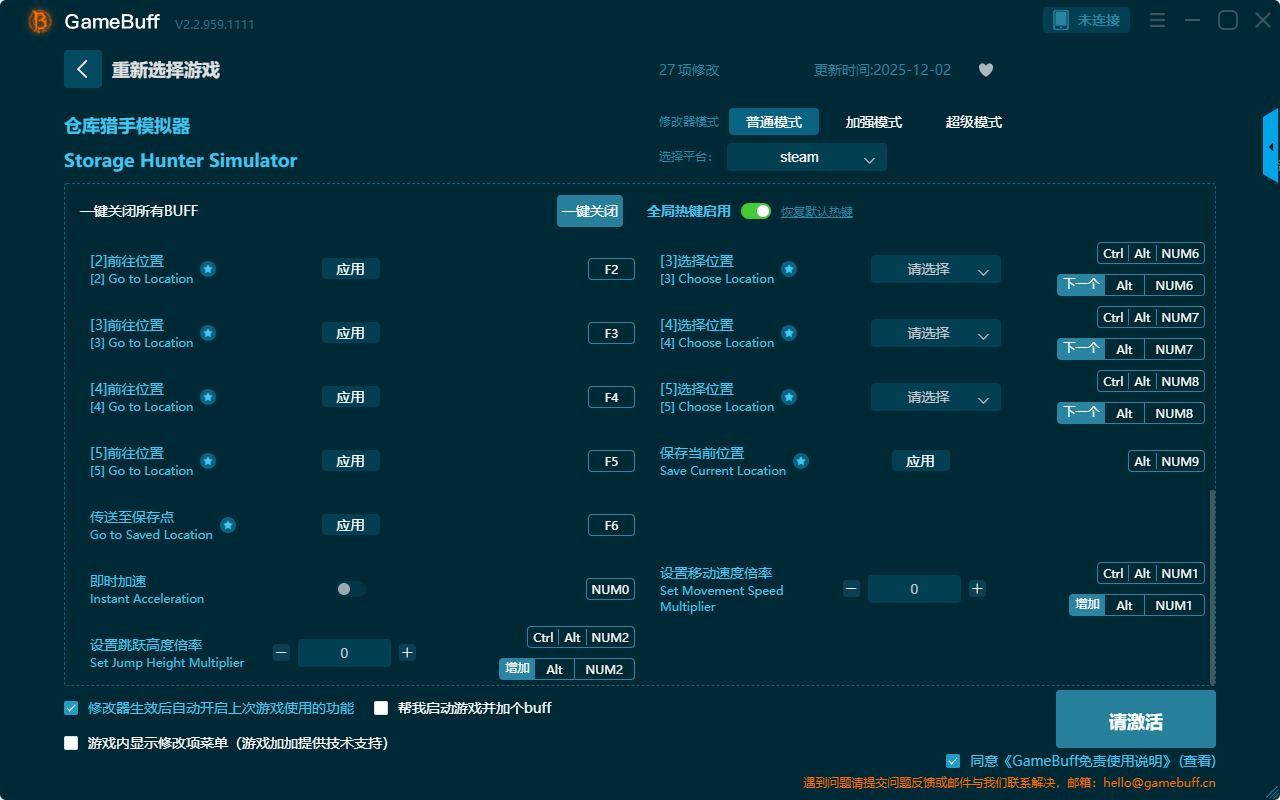 仓库猎杀模拟器二十七项修改器是一款可以自由根据在仓库猎杀模拟器这款游戏中遇到的困难设置拥有无限金钱、设置金钱、增加100个声望、设置时间速度、减少1小时、增加1小时、敌人无法出价、设置声望倍率、无限燃料、停止时间、即时加速、设置移动速度倍率、设置跳跃高度被困、传说至保存点等二十七项功能内容,感兴趣的玩家千万不要错过哦!