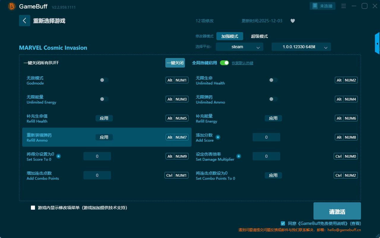 漫威宇宙入侵十二项修改器是一款操作极其简单的游戏辅助修改器工具,支持自由设置拥有无敌模式、无限生命、无限弹药、补充能量、添加分数、设定伤害倍率、补充生命值、无限能量、将得分设置为0、增加连击点数、将连击点数设为0等十二项功能内容,感兴趣的玩家千万不要错过哦!