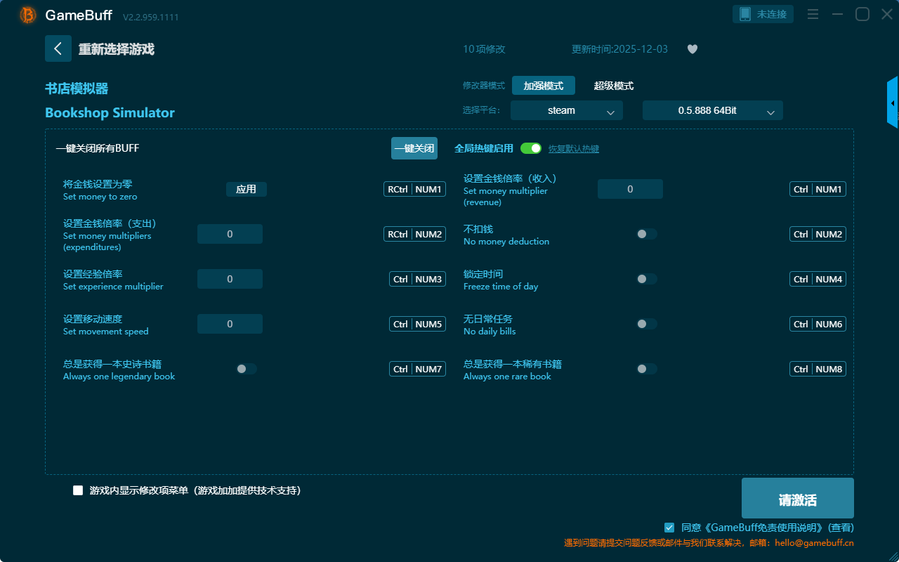 书店模拟器十项修改器是一款操作极其简单的游戏辅助修改器工具,功能也很强大实用,支持一键设置拥有将金钱设置为零、设置金钱倍率、不扣钱、锁定时间、无日常生活、总是获得一本稀有书籍、设置移动速度、总是获得一本史诗书籍、设置经验倍率等十项功能内容,感兴趣的玩家千万不要错过哦!