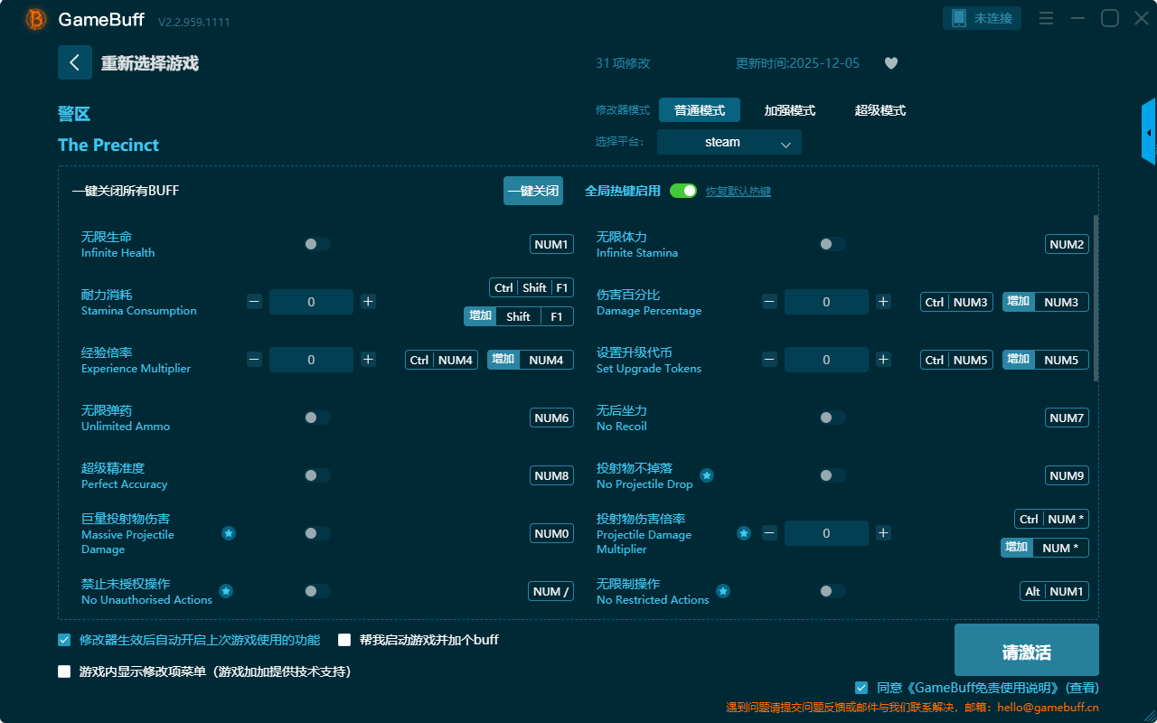2、功能项出现开启失败或是无法正常生效的情况时,优先检查当前游戏版本与修改器的对应版本是否一致,并尝试重新启动游戏和修改器。