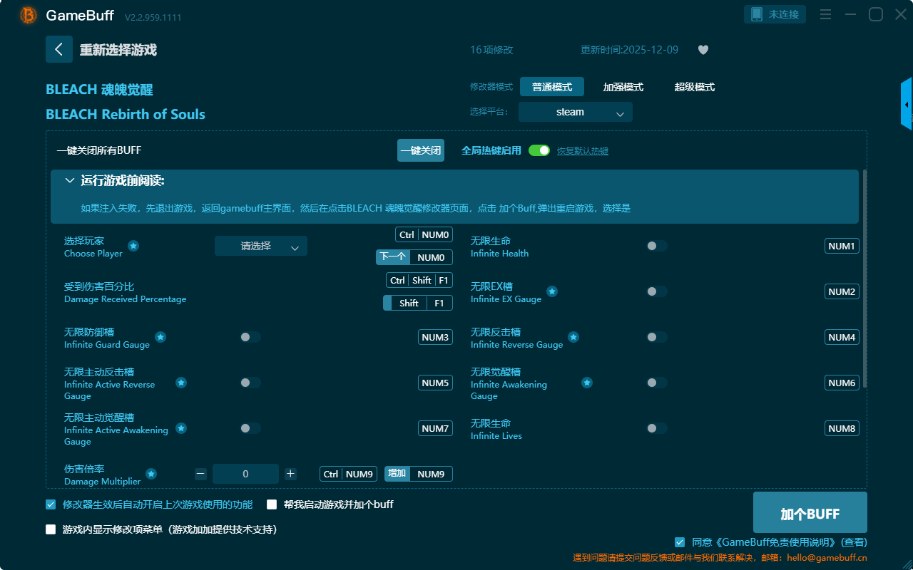BLEACH魂魄觉醒十六项修改器是一款功能强大实用的游戏辅助修改器工具,操作十分的简单,可以一键设置拥有无限防御槽、无限生命、无限EX槽、伤害倍率、无限主动觉醒槽、无限反击槽、受到伤害百分比、一击必杀、敌人无防御槽、无觉醒槽等十六项功能内容,感兴趣的玩家千万不要错过哦!