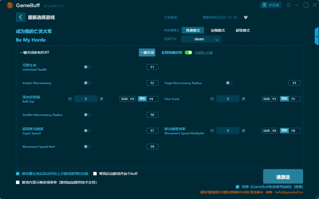 成为我的亡灵大军九项修改器是一款操作极其简单的游戏辅助修改器工具,功能也很强大实用吗,支持一键设置拥有无限生命、移动速度倍率、超级移动速度、添加经验值、Instant Necromancy、Smaller Necromancy Radius、Movement SpeedNerf、Give Souls等九项功能内容,感兴趣的玩家千万不要错过哦!