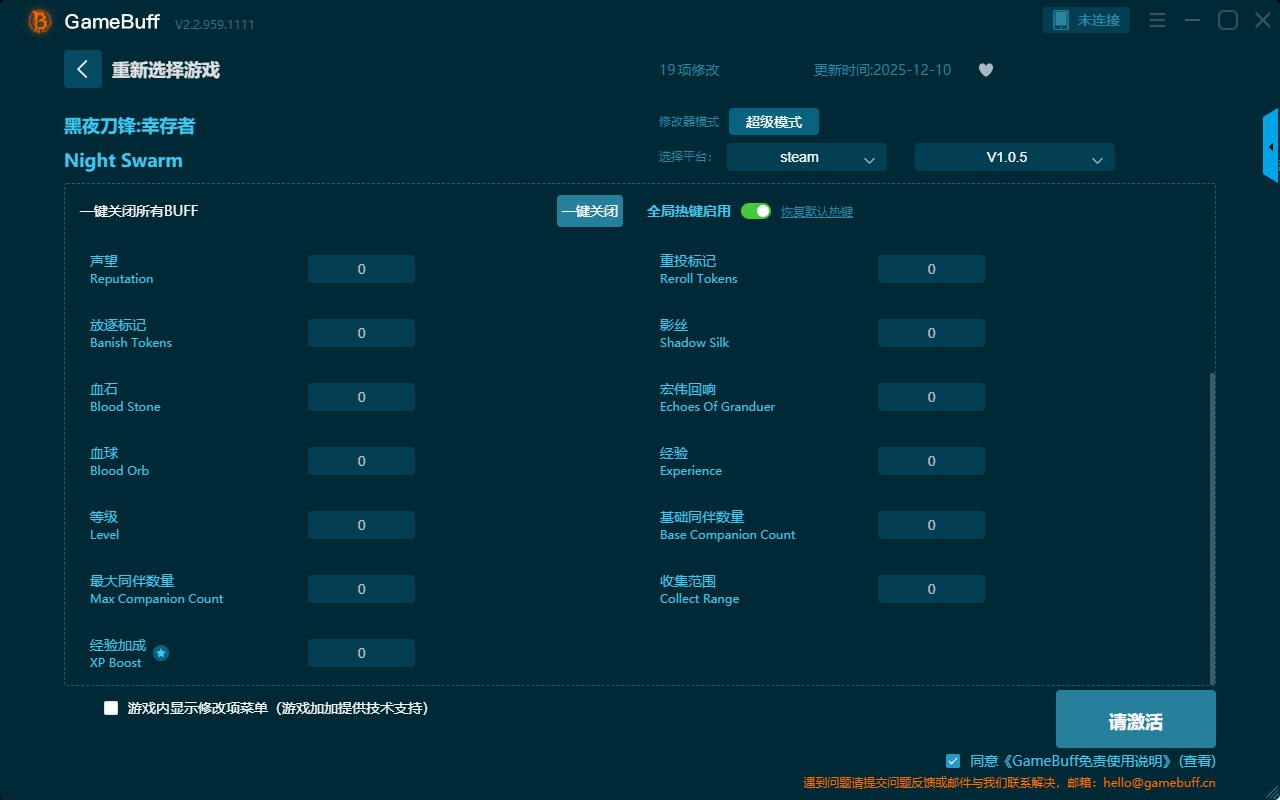 黑夜刀锋:幸存者十九项修改器是一款操作极其简单的游戏辅助修改器工具,功能也很强大实用,支持一键设置拥有无敌、无限护盾、无限生命、游戏速度、紫色精华、经验、血石、血球、声望、金钱、等级、最大同伴数量、经验加成、收集范围、宏伟回响等十九项功能内容,感兴趣的玩家千万不要错过哦!