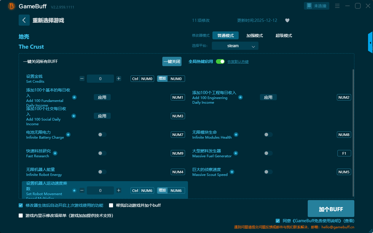 地壳十一项修改器是一款操作极其简单的游戏辅助修改器工具,功能也很强大实用,支持一键设置拥有设置金钱、添加100个工程每日收入、无限模块生命、大型燃料发生器、巨大的侦察速度、无限机器人能量、电池无限电力、无限机器人能量、设置机器人运动速度乘数、添加100个基本的每日收入等十一项功能内容,感兴趣的玩家千万不要错过哦!