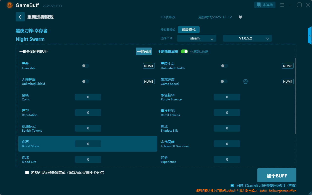 黑夜刀锋:幸存者十九项修改器是一款操作十分简单的游戏辅助修改器工具,功能强大实用,支持一键设置拥有无敌、无限护盾、无限生命、紫色精华、重投标记、影丝、经验、血石、血球、放逐能标记、声望、金钱、收集范围、基础同伴数量、最大同伴数量、经验加成、等级等十九项功能内容,感兴趣的朋友不要错过哦!