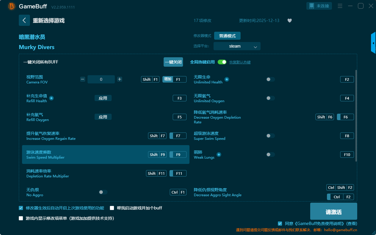 暗黑潜水员十七项修改器是一款功能强大实用的游戏辅助修改器工具,操作也很简单,根据本身在游戏中遇到的困难选择一键设置视野范围、补充生命值、无限生命、无限氧气、超级游泳速度、游泳速度乘数、消耗速率倍率、无仇恨、补充氧气、所有敌人都具有攻击性、刷新仇恨列表等十七项功能内容,感兴趣的玩家千万不要错过哦!