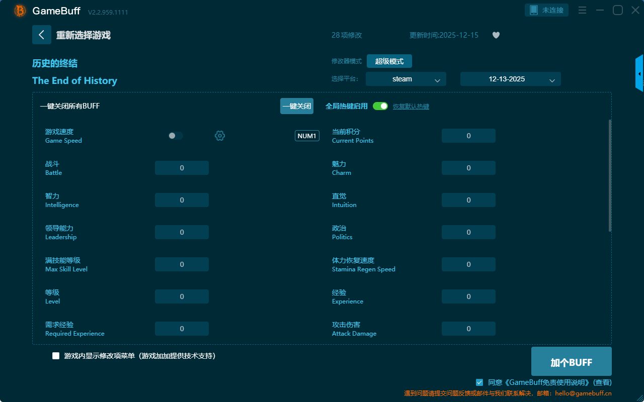 历史的终结二十八项修改器是一款操作极其简单的游戏辅助修改器工具,功能强大实用,根据本身在游戏中遇到的困难自由一键设置拥有游戏速度、当前积分、魅力、直觉、政治、体力恢复速度、经验、攻击伤害、等级需求经验、智力、战斗、领导能力、满技能等级、直觉经验、统率经验、当前理智值、当前生命值、魅力经验值、战斗经验值、政治经验、最大生命值等二十八项功能内容,感兴趣的玩家千万不要错过哦!