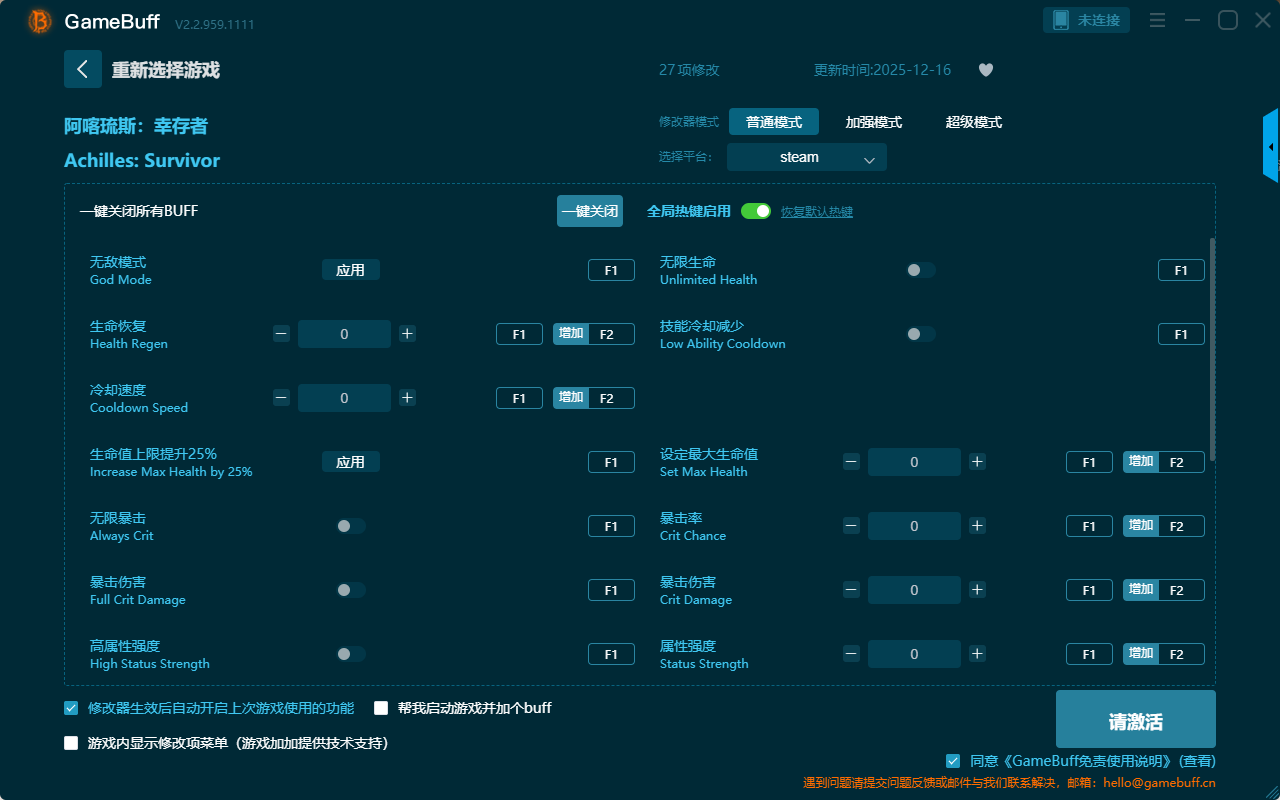 阿喀琉斯:幸存者二十七项修改器是一款功能强大实用的游戏辅助修改器工具,操作十分简单,可自由一键设置拥有无敌模式、技能冷却减少、生命恢复、设定最大生命值、无限生命、暴击率、暴击伤害、属性强度、无限暴击、高属性强度、冷却速度、生命值上线提升25%、运气、高运气、超级移动速度等二十七项功能内容,感兴趣的朋友不要错过哦!