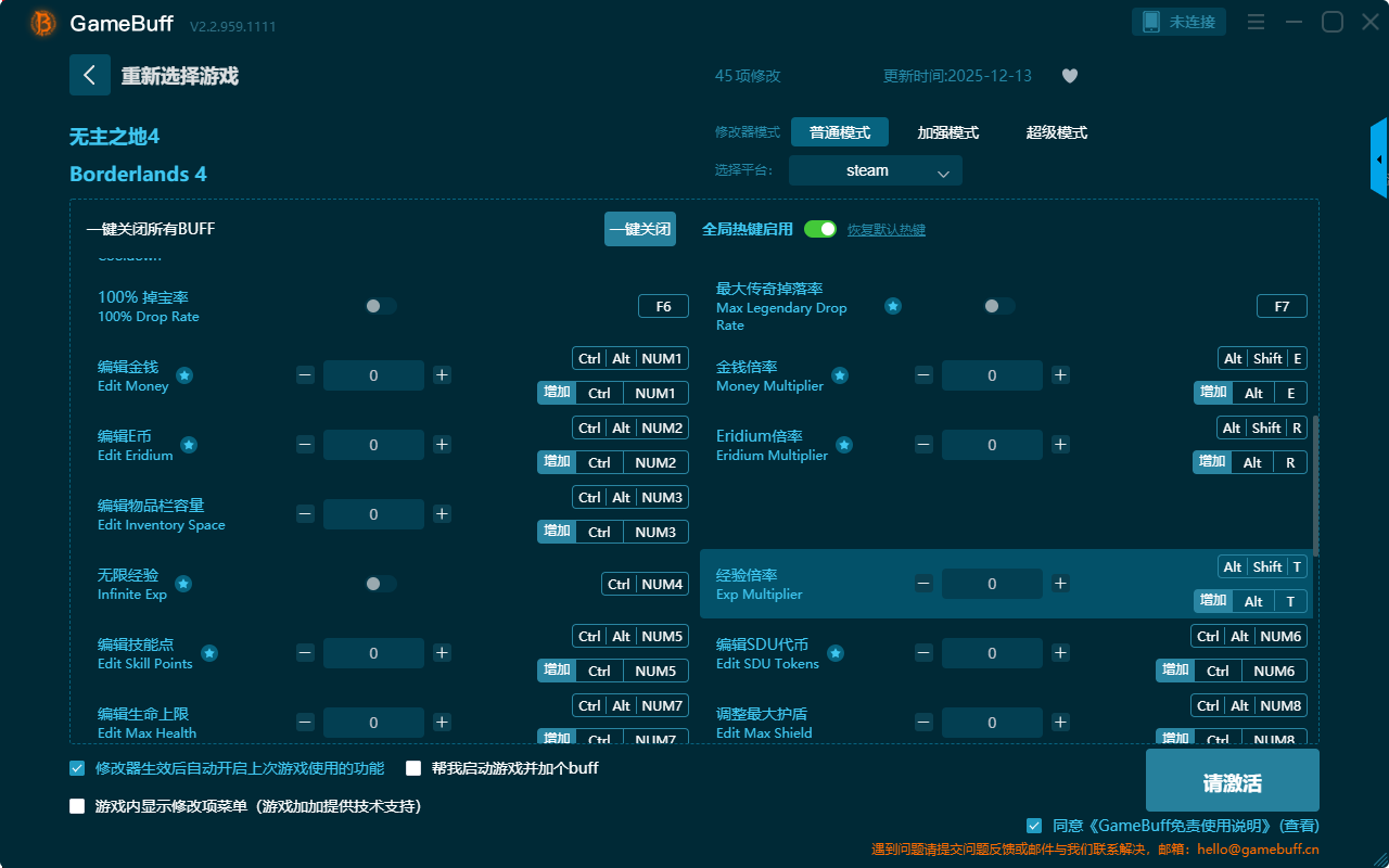 无主之地4四十五项修改器是一款功能强大实用的游戏辅助修改器工具,操作极其简单,可自由设置拥有无敌模式、无限盾、无限生命、无限弹药、瞬间装弹、快速射击、无限滑翔时间、技能瞬间冷却、无后坐力、无视修复套件冷却、无限技能持续时间、超级精准度、编辑技能点、编辑生命上限、金钱倍率等四十五项功能内容,感兴趣的朋友不要错过哦!