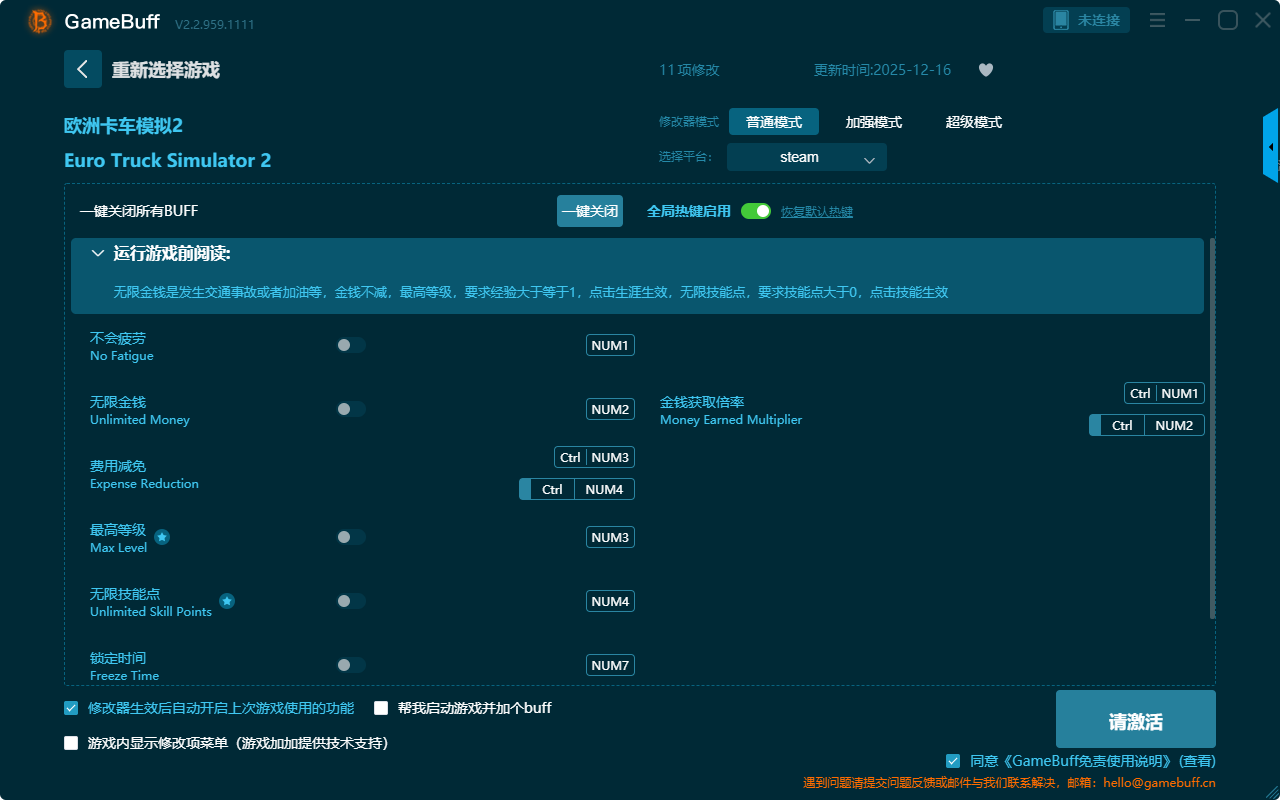 欧洲卡车模拟2十一项修改器是一款操作极其简单的游戏辅助修改器工具,功能强大实用,可以自由根据本身在游戏中遇到的困难与挑战设置拥有不会疲劳、金钱获取倍率、无限金钱、最高等级、无限技能点、锁定时间、费用减免、无限燃料、没有伤害等十一项功能内容,感兴趣的朋友不要错过哦!