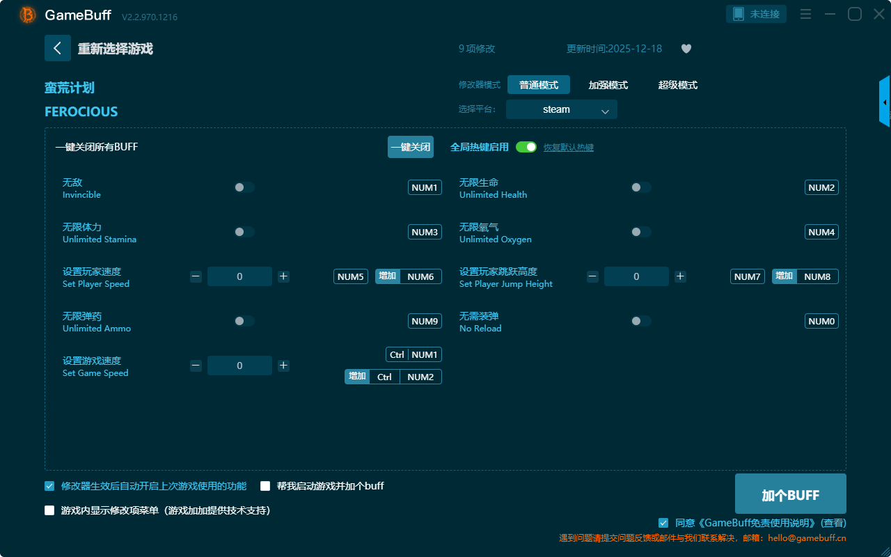 蛮荒计划九项修改器是一款操作极其简单的游戏辅助修改器工具,功能强大实用,支持一键设置拥有无敌、无限体力、设置玩家速度、无限弹药、设置游戏速度、无限氧气、无限生命、无需装弹等九项功能内容,轻松体验游戏带来的乐趣与快感,感兴趣的朋友不要错过哦!