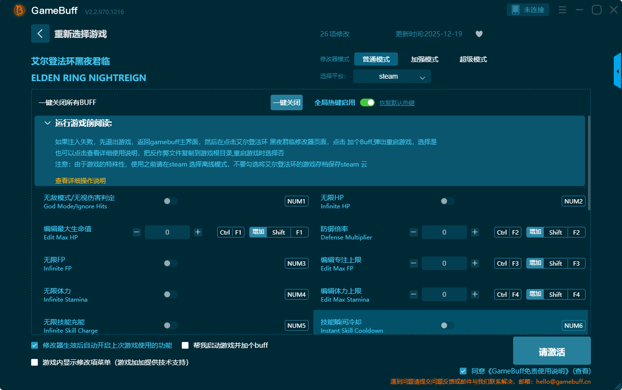 艾尔登法环黑夜君临二十六项修改器是一款功能强大实用的游戏辅助修改器工具,操作也很简单,可以自由设置拥有无敌模式、编辑最大生命值、无限FP、无限体力、无限技能充能、一击必杀、锁定当天时间、伤害倍率、向上飞行、激活飞行模式、向下飞行、锁定AI位置等二十六项功能内容,感兴趣的朋友不要错过哦!