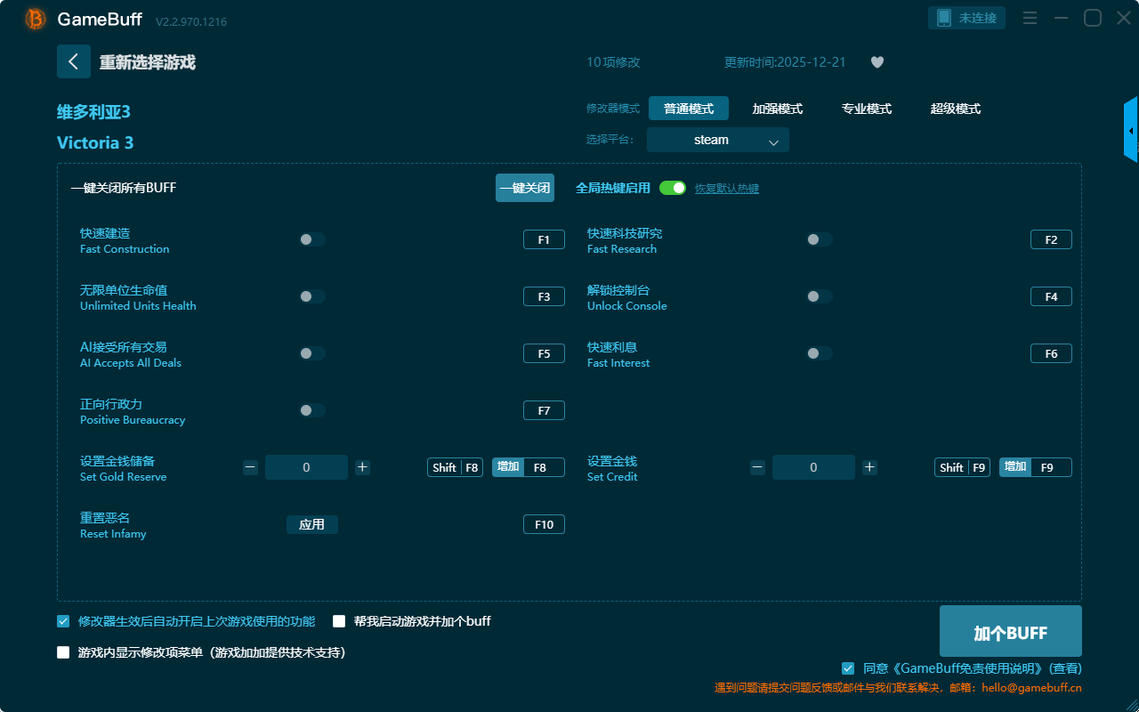 维多利亚3十项修改器是一款功能强大实用的游戏辅助修改器工具,操作十分的简单易上手,支持一键设置拥有快速建造、快速科技研究、AI接受所有交易、正向行政力、设置金钱储备、重置恶名、设置金钱、快速利息、无限单位生命值等十项功能内容,感兴趣的朋友不要错过哦!