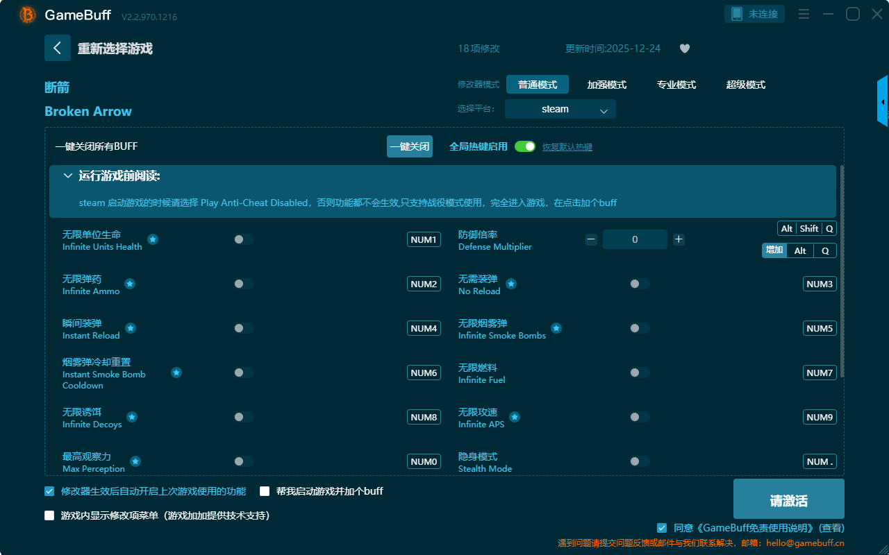 断箭十八项修改器是一款可以根据在断箭这款游戏中遇到的各种问题困难一键设置拥有无限单位生命、无限弹药、瞬间装弹、无限燃料、无限攻速、隐身模式、最高观察力、无限诱饵、烟雾弹冷却重置、防御倍率、无需装弹、编辑金钱、一击必杀、解锁全部任务、设置游戏速度、伤害倍率、超级伤害等十八项功能内容,感兴趣的朋友不要错过哦!
