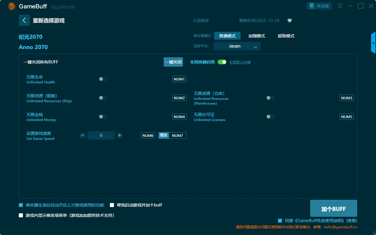 纪元2070六项修改器是一款操作极其简单的游戏辅助修改器工具,功能强大实用,根据本身在纪元2070这款游戏中遇到的各种困难与挑战,一键设置拥有无限生命、无限资源、无限许可证、无限金钱、无限资源船舶、设置游戏速度等六项功能内容,感兴趣的玩家千万不要错过哦!