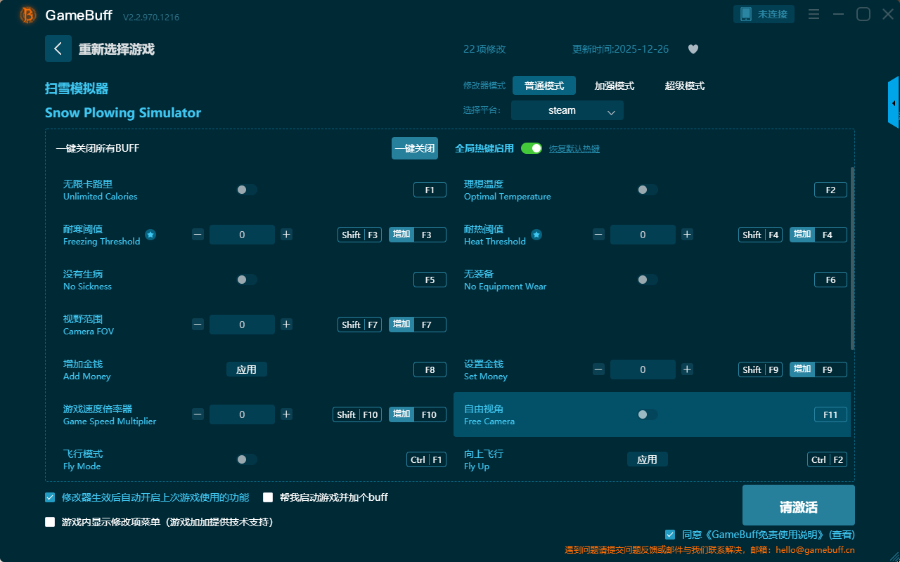 扫雪模拟器二十二项修改器是一款功能强大实用的游戏辅助修改器工具,支持自由设置拥有无限卡路里、理想温度、无装备、设置金钱、自由视角、向上飞行、增加金钱、飞行模式、游戏速度倍率器、没有生病、视野范围、超级移动速度、重力低、重力比例、跳跃高度倍率、玩家速度倍率、没有剪辑等二十二项功能内容,感兴趣的玩家不要错过哦!