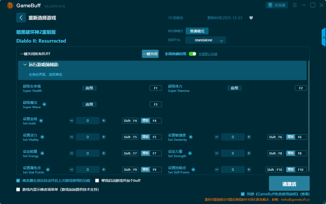 暗黑破坏神2重制版十项修改器是一款功能强大的游戏辅助修改器工具,操作十分简单,自由一键设置拥有超级生命值、超级体力、设置敏捷度、设定力量、设置技能点、设置金钱、设置活力、设定能量、设置属性点、超级魔法等十项功能内容,感兴趣的玩家千万不要错过哦!