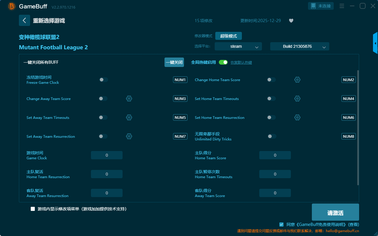 变种橄榄球联盟2十五项修改器是一款操作极其简单的游戏辅助修改器工具,功能强大实用,可自由根据本身在游戏中遇到的困难,一键设置拥有冻结游戏时间、无限卑鄙手段、主队得分、主队暂停次数、客队得分、主队复活、客队复活、游戏时间、客队暂停次数等十五项功能内容,感兴趣的玩家千万不要错过哦!