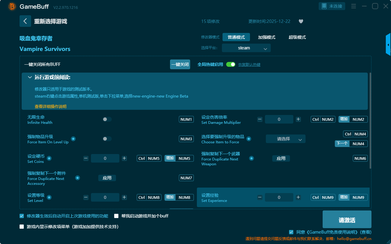 吸血鬼幸存者十五项修改器是一款操作极其简单的游戏辅助修改器工具,操作极其简单,根据本身在游戏中遇到的困难一键设置拥有无限生命、强制物品升级、设定硬币、设定伤害倍率、设置经验、设置等级、强制复制下一个附件、选择要强制升级的物品等十五项功能内容,感兴趣的玩家千万不要错过哦!