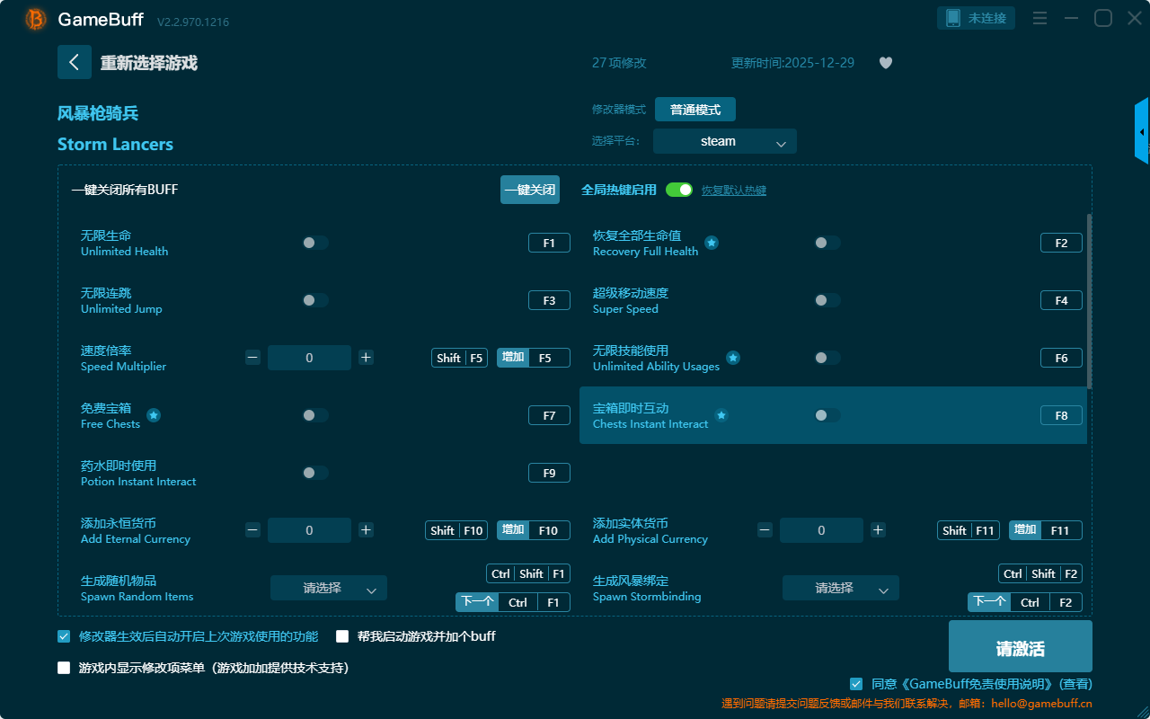 风暴枪骑兵二十七项修改器是一款操作极其简单的游戏辅助修改器工具,功能强大,自由设置无限生命、无限连跳、速度倍率、免费宝箱、宝箱即时互动、添加实体货币、生成风暴绑定、生成随机物品、药水即时使用、添加永恒货币、超级移动速度、无限技能使用、一击模式、重力比例等二十七项功能内容,感兴趣的玩家不要错过哦!