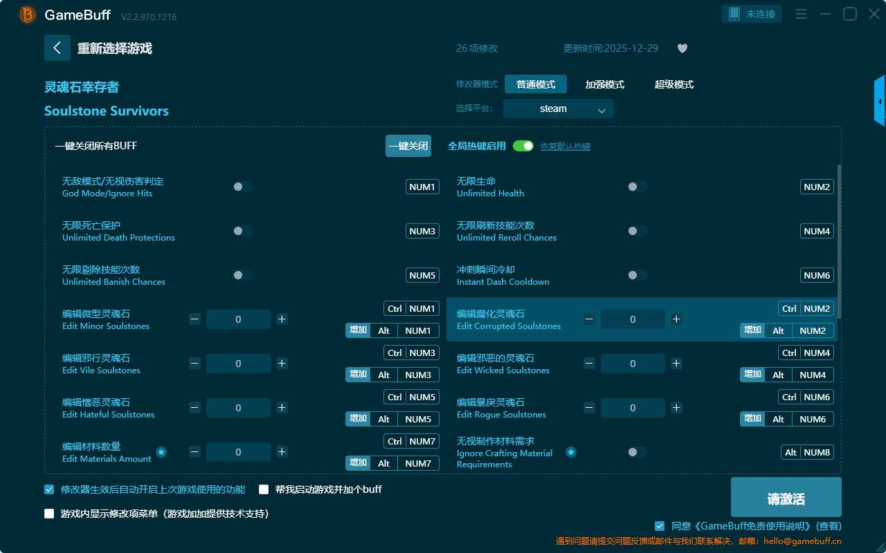 灵魂石幸存者二十六项修改器是一款操作极其简单的游戏辅助修改器工具,功能强大实用,可一键设置无敌模式、无视伤害判定、无限生命、冲刺瞬间冷却、编辑腐化灵魂石、编辑微型灵魂石、编辑邪行灵魂石、编辑材料数量、无限死亡保护、一击必杀、设置游戏速度、超级伤害等二十六项功能内容,感兴趣的玩家快来当游网下载体验一下吧!