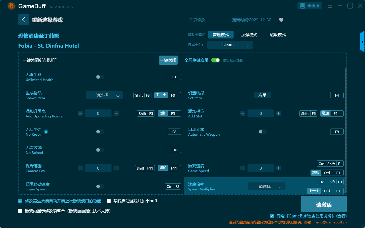 恐怖酒店圣丁菲娜十二项修改器是一款功能强大实用的游戏辅助修改器工具,操作极其简单,可一键设置拥有无限生命、设置物品、添加栏位、自动武器、游戏速度、速度倍率、超级移动速度、视野范围、添加升级点、无后坐力、无需装弹、生成物品、自动武器等十二项功能内容,感兴趣的玩家不要错过哦!