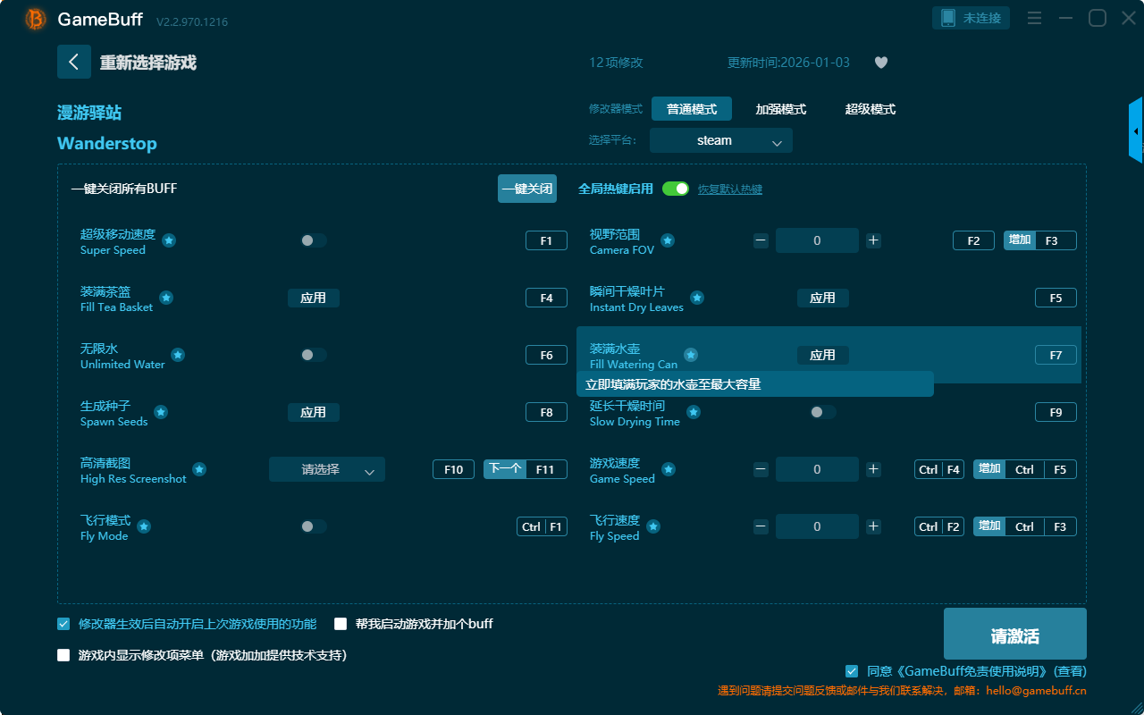 漫游驿站十二项修改器是一款操作极其简单的游戏辅助修改器工具,功能强大实用,可以自由设置拥有超级移动速度、视野范围、瞬间干燥叶片、装满水壶、延长干燥时间、游戏速度、飞行速度、高清截图、飞行模式、生成种子、无限水等十二项功能内容,感兴趣的玩家不要错过哦!