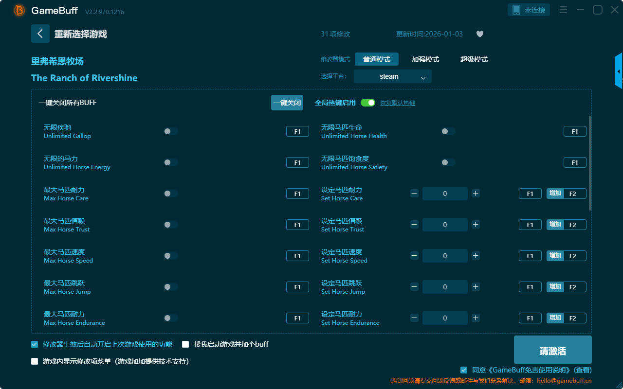 里弗希恩牧场三十一项修改器是一款操作极其简单的游戏辅助修改器工具,功能强大可自由设置拥有无限疾驰、无限的马力、无限马匹生命、无限马匹饱食度、设定马匹耐力、玩家速度倍率、高清截图、没有剪辑、超级移动速度、游戏速度倍率器、增加金钱、视野范围、最大马匹驯服度等三十一项功能内容,感兴趣的玩家不要错过哦!