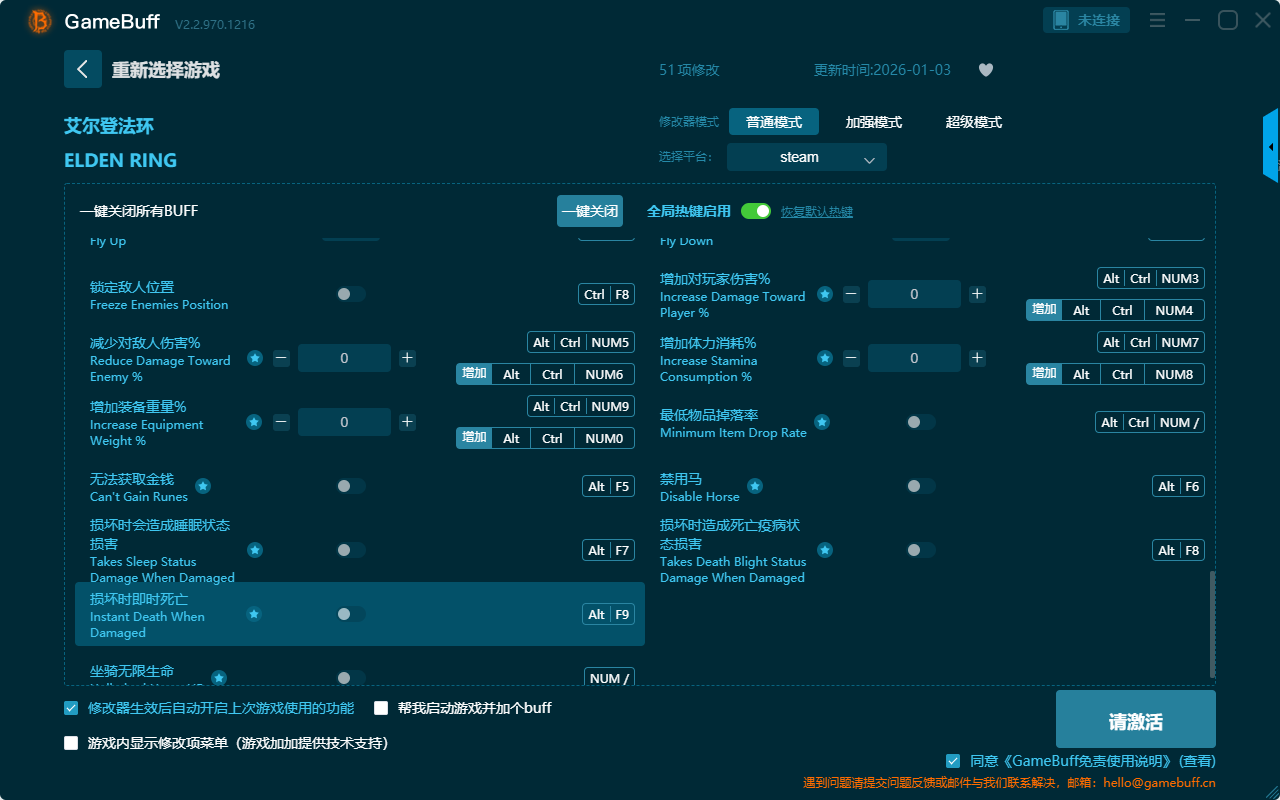艾尔登法环五十一项修改器是一款可以自由根据本身在游戏中遇到的困难挑战灵活设置五十一项功能内容的游戏辅助修改器工具,包含了无敌模式、补充生命值、无限生命、无限专注、零负重、耐力恢复速率、无限体力、补满FP、法力消耗率%、隐身模式、编辑最大生命值、编辑专注上限、无限物品使用、免疫全部异常状态、无法获取金钱、减少对敌人伤害%、坐骑无限生命、损坏时造成死亡疫病、禁用马等功能,感兴趣的朋友不要错过哦!