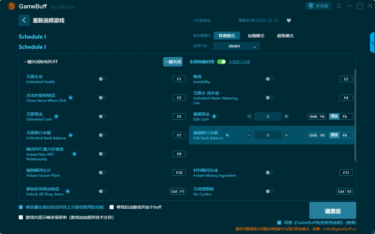 Schedule I十八项修改器是一款功能强大的游戏辅助修改器工具,操作十分简单易上手,可以自由设置无限生命、隐身、无限水、编辑现金、植物瞬间生长、解锁所有商品物品、材料瞬间合成、无限现金、无限银行余额、瞬间NPC最大好感度、时间停止、倒退一小时、移动速度倍率、无需调查等十八项功能内容,感兴趣的玩家不要错过哦!