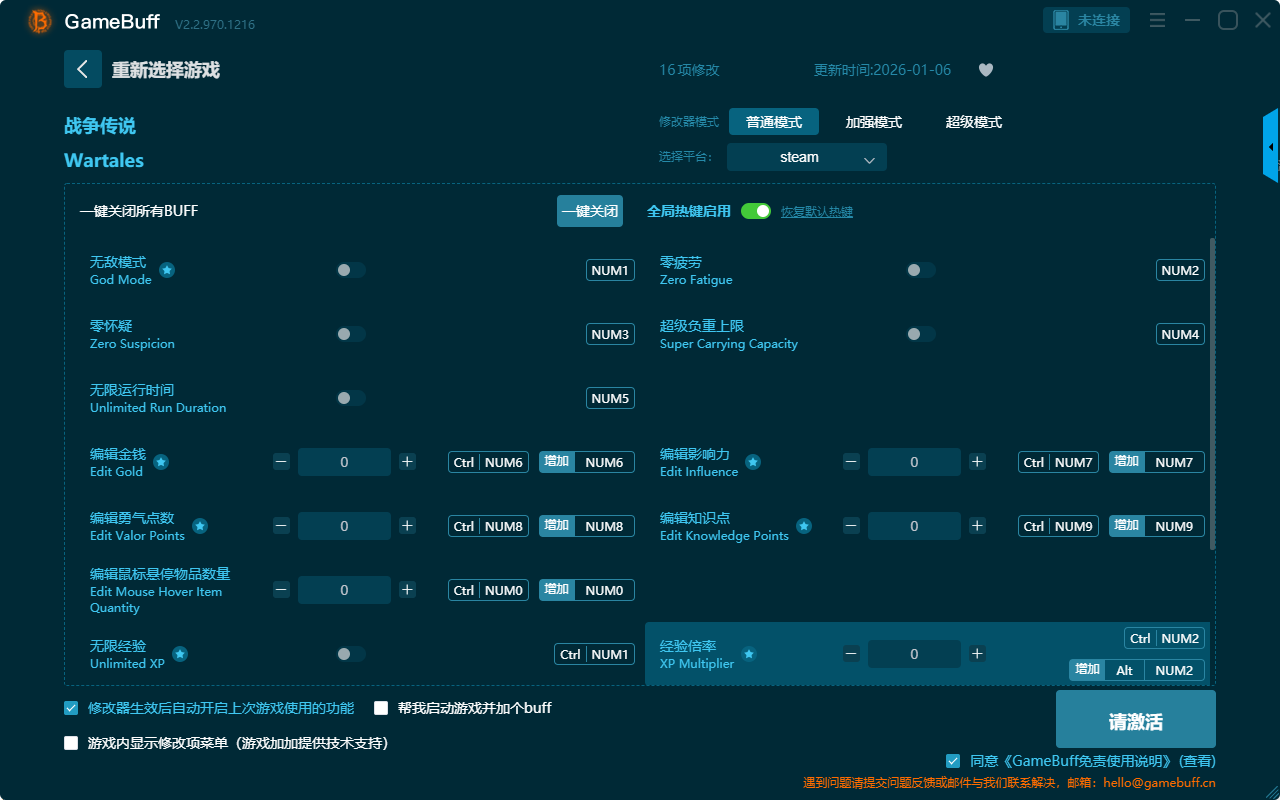 战争传说十六项修改器是一款操作极其简单的游戏辅助修改器工具,功能强大实用可自由设置拥有无敌模式、零疲劳、编辑影响力、编辑知识点、经验倍率、编辑勇气点数、零怀疑、超级负重上限、无限运行时间、无限经验、伤害倍率、一击必杀、设置游戏速度、超级伤害等十六项功能内容,感兴趣的玩家千万不要错过哦!