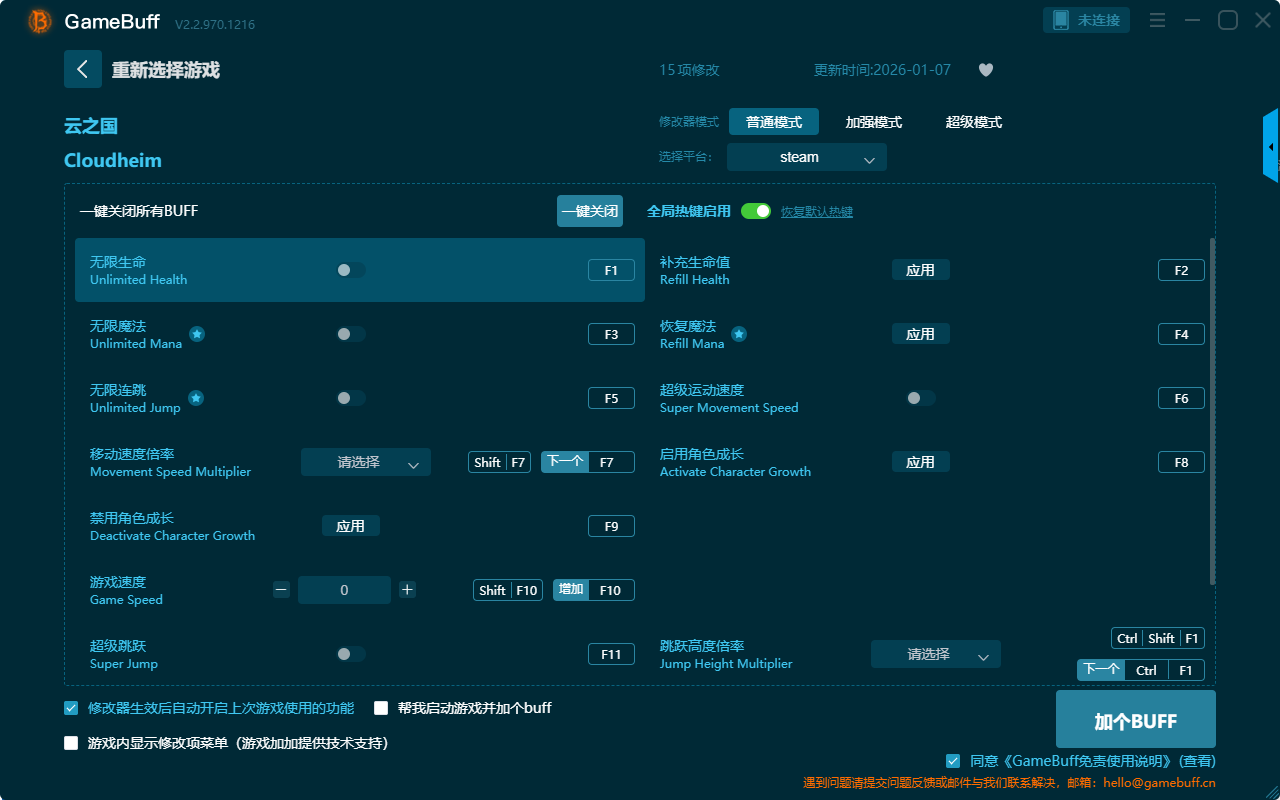 云之国十五项修改器是一款操作极其简单的游戏辅助修改器工具,功能强大实用,可自由设置拥有无限生命、补充生命值、恢复魔法、超级运动速度、启用角色成长、跳跃高度倍率、禁用角色成长、游戏速度、无限连跳、移动速度倍率、重力低、设定默认重力等十五项功能内容,感兴趣的玩家千万不要错过哦!