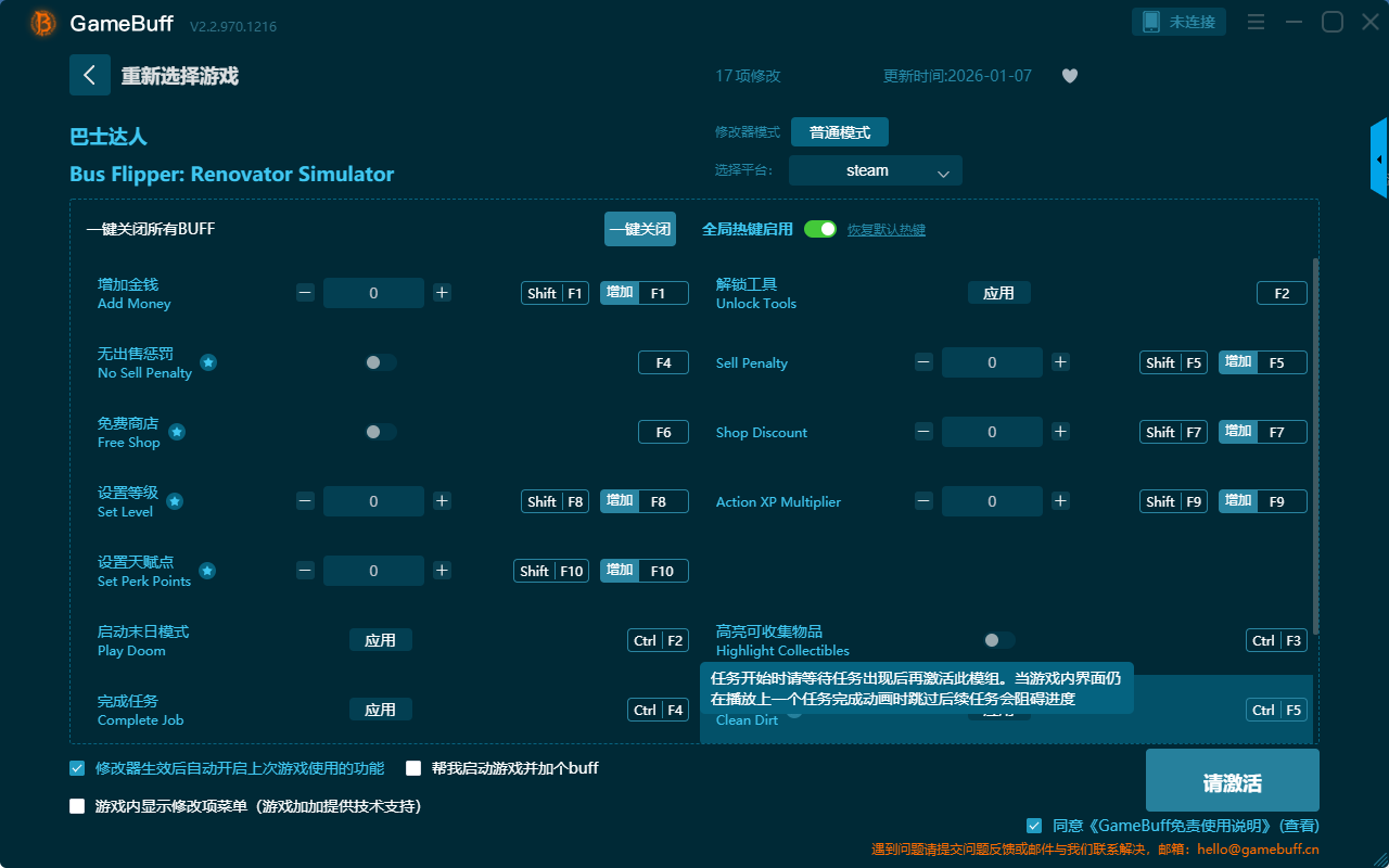巴士达人十七项修改器是一款操作极其简单的游戏辅助修改器工具,可自由设置拥有增加金钱、解锁工具、高亮可收集物品、完成任务、设置等级、免费商店、无出售惩罚、启用末日模式、清理垃圾、10K巴士折扣、设置天赋点等十七项功能内容,感兴趣的玩家千万不要错过哦!