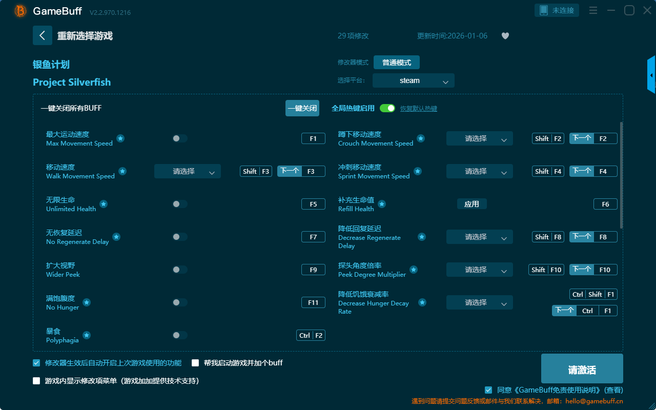 银鱼计划二十九项修改器是一款操作极其简单的游戏辅助修改器工具,可自由一键设置拥有最大运动速度、移动速度、蹲下移动速度、补充生命值、冲刺移动速度、降低恢复延迟、探头角度倍率、降低饥饿衰减度、满饱腹度、暴食、扩大视野、移动速度、无限生命、无恢复延迟等二十九项功能内容,感兴趣的玩家千万不要错过哦!