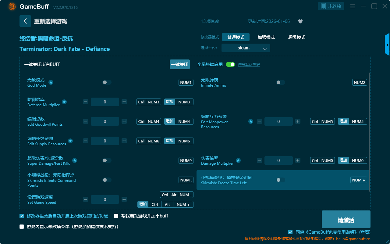 终结者:黑暗命运-反抗十三项修改器是一款操作极其简单易上手的游戏辅助修改器工具,功能强大可一键设置拥有无敌模式、无限弹药、伤害倍率、超级伤害、快速杀敌、设置游戏速度、防御倍率、编辑点数、编辑补给资源、小规模战役:无限指挥点等十三项功能内容,感兴趣的玩家千万不要错过哦!