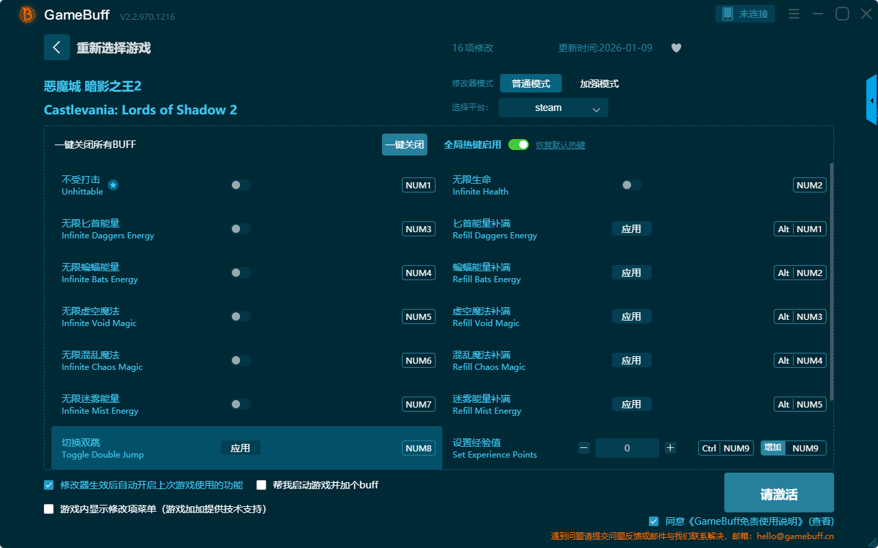 恶魔城:暗影之王2十六项修改器是一款功能简单实用的游戏辅助修改器工具,可自由设置拥有不受打击、无限生命、匕首能量补满、蝙蝠能量补满、虚空魔法补满、混乱魔法补满、迷雾能量补满、设置经验值、切换双跳、无限混乱能量、无限迷雾能量、一击必杀、切换渲染信息等十六项功能内容,感兴趣的玩家快来当游网下载体验一下吧!