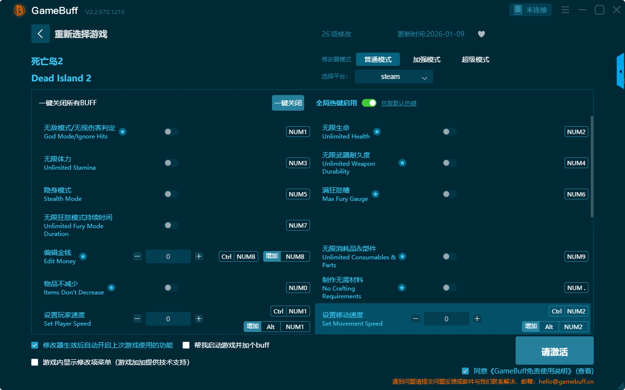 死亡岛2二十六项修改器是一款操作极其简单的游戏辅助修改器工具,功能强大实用,可自由一键设置拥有无敌模式、无限生命、无限武器耐久度、制作无需材料、设置移动速度、编辑金钱、物品不减少、设置玩家速度、无限体力、隐身模式、一击必杀、超级体力伤害等二十六项功能内容,感兴趣的玩家千万不要错过哦!