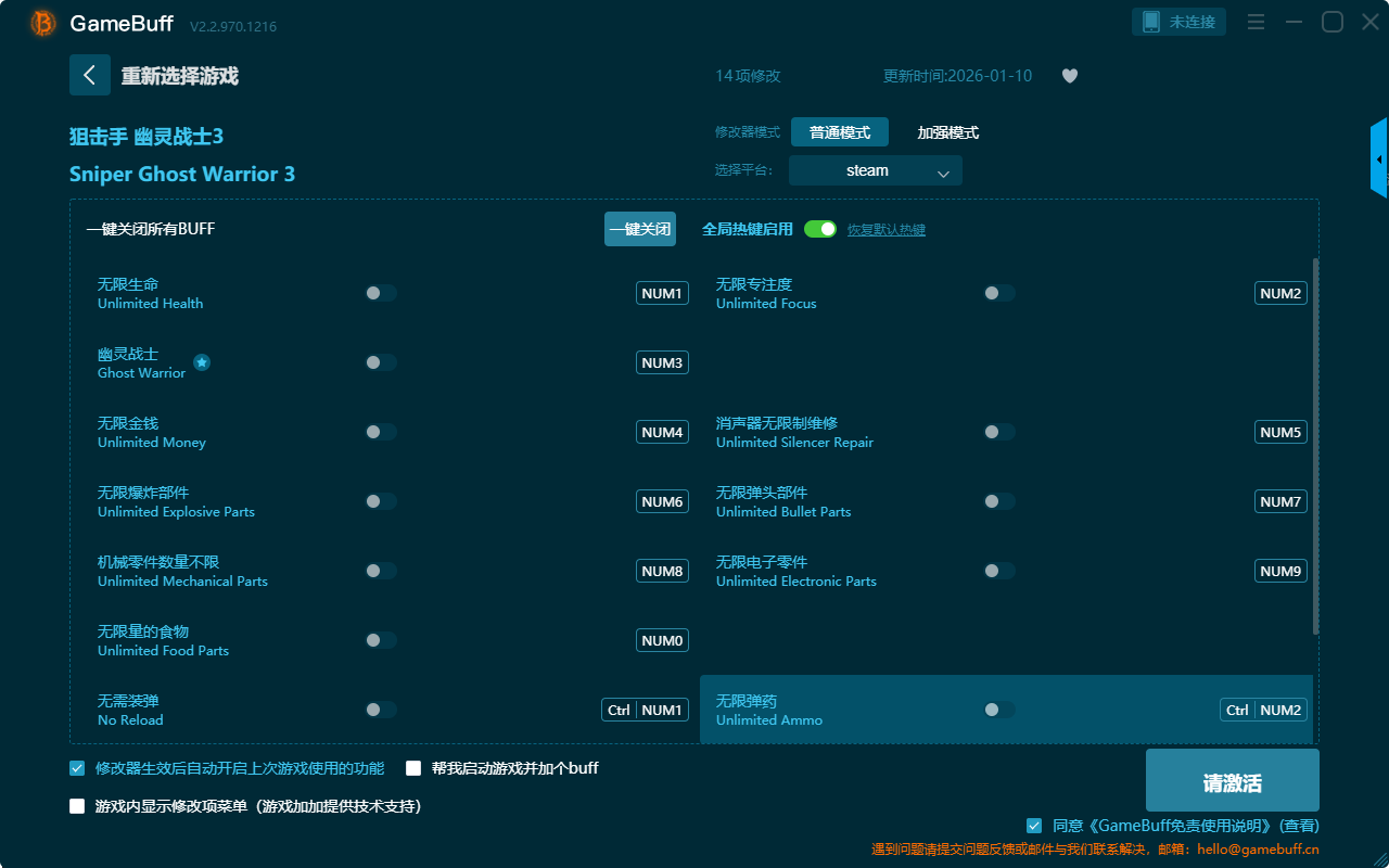 狙击手幽灵战士3十四项修改器是一款操作极其简单的游戏辅助修改器工具,可自由根据本身的需求一键设置拥有无限生命、无限专注度、无限弹头部件、无限电子零件、无限弹药、无需装弹、无限量的食物、无限爆炸部件、幽灵战士、设置游戏速度、无限消音器等十四项功能内容,感兴趣的玩家不要错过哦!