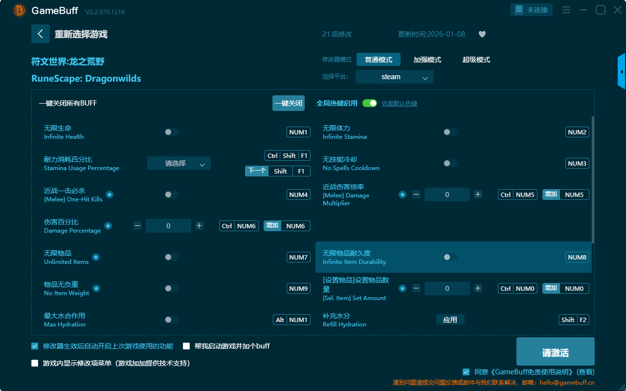 符文世界:龙之荒野二十一项修改器是一款操作极其简单的游戏辅助修改器工具,功能强大实用,可自由一键设置拥有无限生命、无限体力、无技能冷却、无限物品耐久度、补充水分、物品无负重、无限物品、最大水合作用、近战一击必杀、耐力消耗百分比、伤害百分比、设置物品数量、完全恢复等二十一项功能内容,感兴趣的玩家不要错过哦!