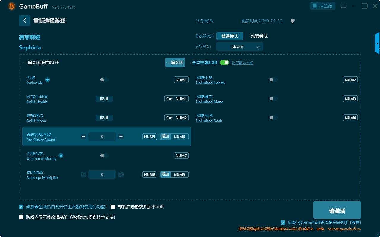 赛菲莉娅十项修改器是一款操作极其简单的游戏辅助修改器工具,根据本身在赛菲莉娅这款游戏中遇到的各种困难与挑战选择设置拥有无敌、无限生命、无限魔法、无限冲刺、恢复魔法、无限金钱、伤害倍率、设置玩家速度等十项功能内容,感兴趣的玩家不要错过哦!