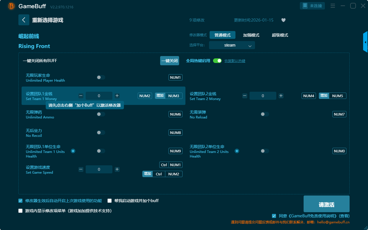 崛起前线九项修改器是一款操作极其简单的游戏辅助修改器工具,可自由设置拥有无限玩家生命、设置团队1金钱、无需装弹、无限团队2单位生命、设置游戏速度、无后坐力、无限团队1单位生命、设置团队2金钱等九项功能内容,感兴趣的玩家不要错过哦!