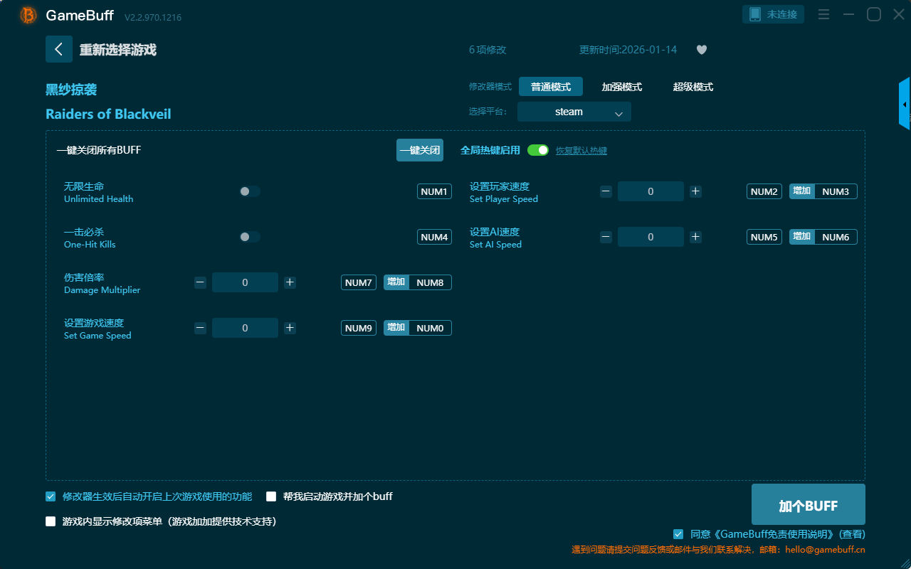 黑纱掠袭六项修改器是一款操作极其简单的游戏辅助修改器工具,功能强大实用,玩家将根据本身在游戏中遇到的困难自由设置拥有无限生命、一击必杀、伤害倍率、设置玩家速度、设置AI速度、设置游戏速度等六项功能内容,感兴趣的玩家千万不要错过哦!