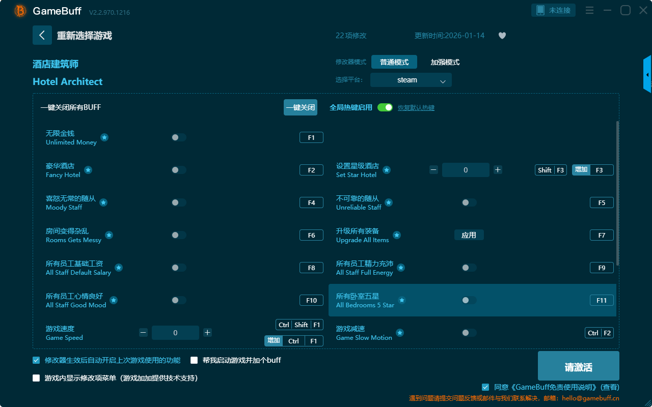 酒店建筑师二十二项修改器是一款功能强大的游戏辅助修改器工具,可一键设置拥有、无限金钱、设置星级酒店、豪华酒店、房间变得杂乱、所有员工心情良好、游戏速度、游戏减速、所有卧室五星、喜怒无常的随从、时间流逝、免费大型施工载具、顾客双倍支付、施工工人免费劳工、所有装备清洁、顾客满健康、所有卧室五星等二十二项功能内容,感兴趣的玩家不要错过哦!
