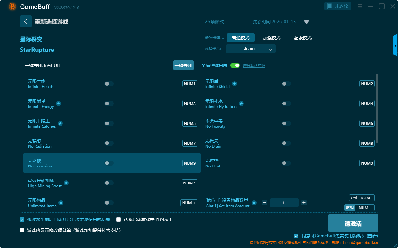 星际裂变二十六项修改器是一款功能强大的游戏辅助修改器工具,可自由设置拥有无限生命、无限能量、无限补水、无限盾、无限卡路里、无辐射、无限物品、无过热、无流失、高效采矿加成、无后坐力、即时加速、移动速度倍率、无坠落伤害、跳跃高度倍率、无武器过热、降低散布等二十六项功能内容,感兴趣的玩家不要错过哦!