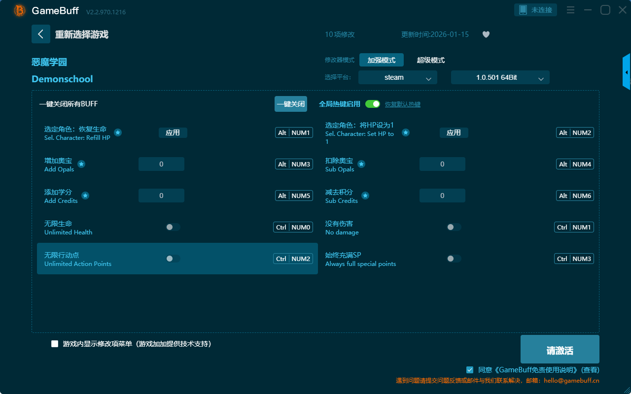 恶魔学园十项修改器是一款功能强大的GameBuff修改器工具,可设置拥有选定角色:恢复生命、增加奥宝、添加学分、无限生命、扣除奥宝、无限行动点、始终充满SP、没有伤害、减去积分、选定角色:将HP设为1等十项功能内容,感兴趣的玩家不要错过哦!