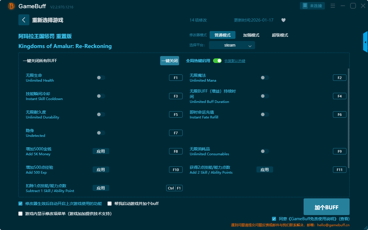 阿玛拉王国:惩罚重置版十四项修改器是一款操作极其简单的游戏辅助修改器工具,功能强大实用,可自由设置拥有无限生命、无限魔法、即时命运充值、无限消耗品、隐身、增加500点经验、增加5000金钱、扣除1点技能点数、无限BUFF、快速击杀等十四项功能内容,感兴趣的玩家不要错过哦!