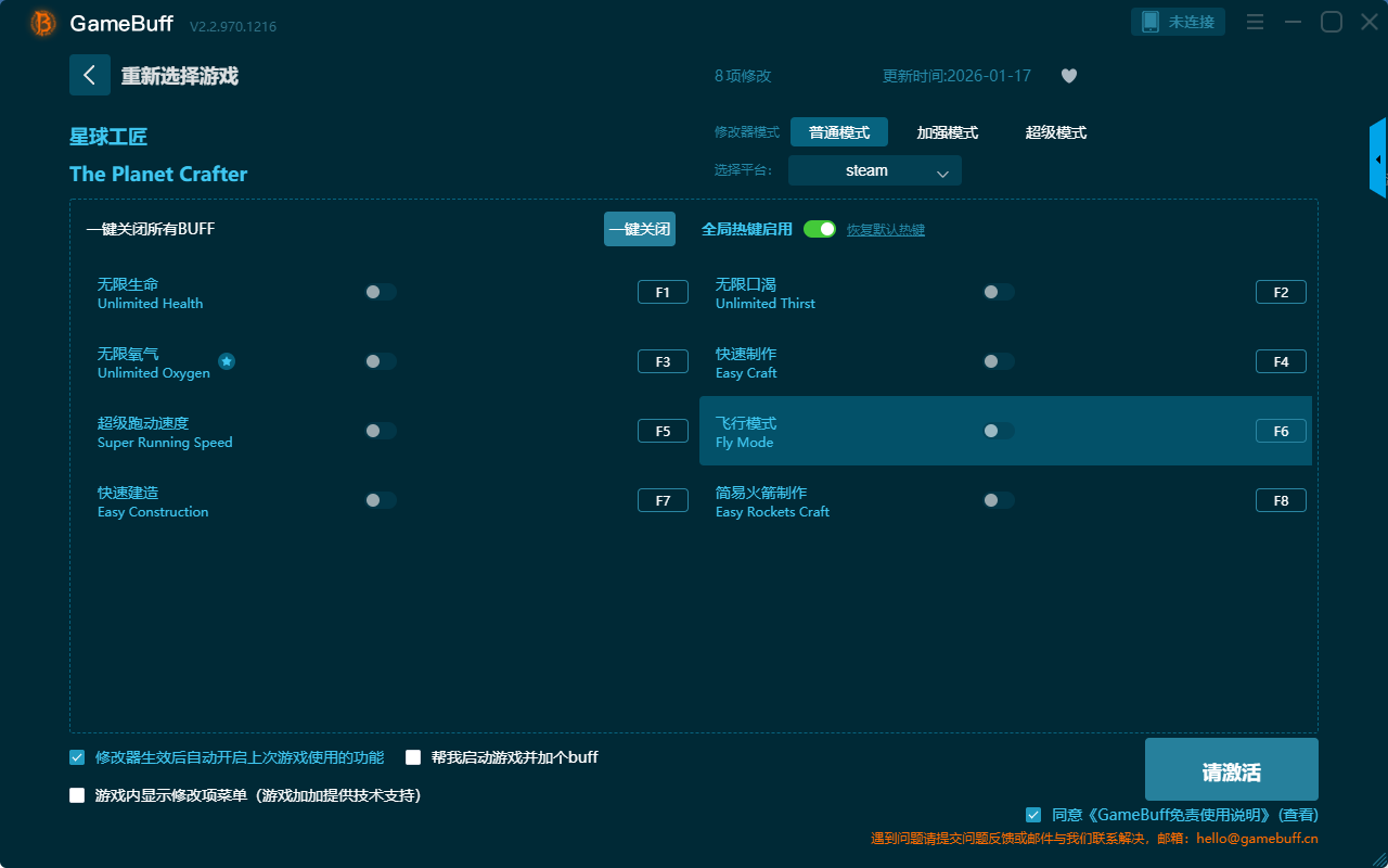 星球工匠八项修改器是一款功能强大实用的游戏辅助修改器工具,操作简单,可一键设置拥有无限生命、无限氧气、无限口渴、快速制作、飞行模式、简易火箭制作、快速建造、超级跑动速度等八项功能内容,感兴趣的玩家不要错过哦!