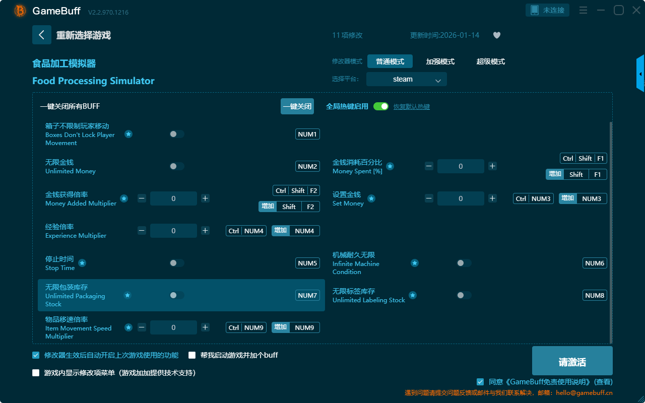 食品加工模拟器十一项修改器是一款功能强大实用的游戏辅助修改器工具,根据本身在游戏中遇到的困难与挑战自由设置拥有箱子不限制玩家移动、金钱消耗百分比、设置金钱、机械耐久无限、无限标签库存、无限包装库存、物品移速倍率、停止时间、经验倍率、金钱获得倍率、无限金钱等十一项功能内容,感兴趣的玩家不要错过哦!