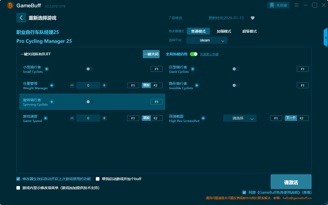 职业自行车队经理25七项修改器是一款可自由根据本身在游戏中遇到的困难与挑战,选择设置不同的功能,灵活设置小型骑行者、巨型骑行者、隐形骑行者、高清截图、游戏速度、旋转骑行者、负重管理等七项功能内容的修改器工具,操作十分的简单,感兴趣的玩家不要错过哦!